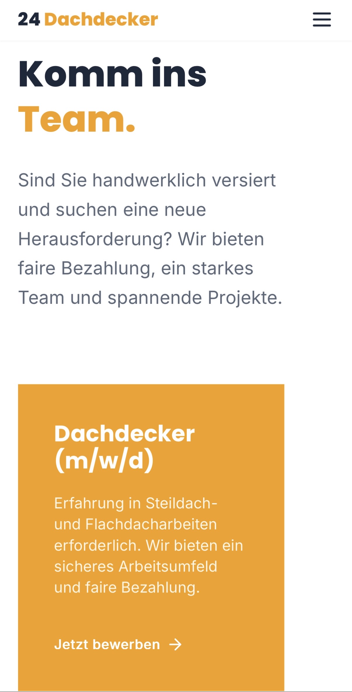 Zu Beginn schauen wir uns an, wo Ihr Dachdeckerbetrieb aktuell steht und welches Ziel im Vordergrund steht: mehr Anfragen, bessere Bewerbungen oder beides. Darauf basierend entwickeln wir einen klaren online Auftritt, der potenzielle Kunden und Bewerber direkt zur Kontaktaufnahme beziehungsweise Bewerbung führt.
