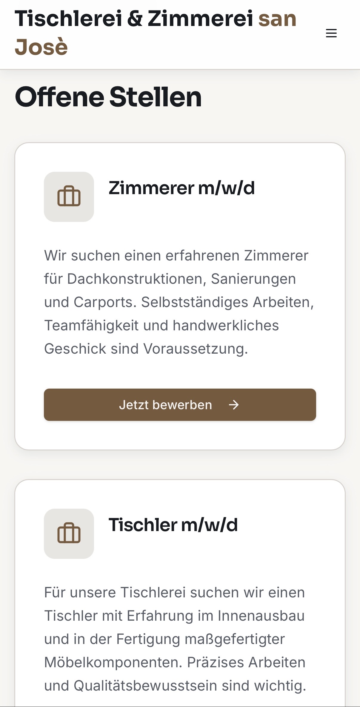 Gute Leute bewerben sich nicht nur auf einen Job, sondern auf einen Betrieb, der einen starken Eindruck macht. Wenn eine Zimmerei online zeigt, wie gearbeitet wird, wie das Team aussieht und wofür der Betrieb steht, steigt die Chance auf passende Bewerbungen deutlich. Wichtig ist dabei auch, dass der Bewerbungsweg einfach bleibt, damit Interessenten nicht an unnötigen Hürden abspringen.